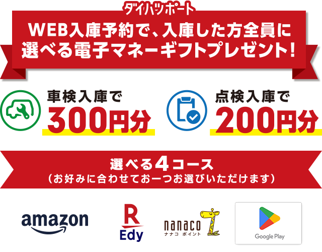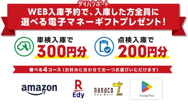 ■ WEB入庫予約は、枠に限りがございます。お早めのご予約をお願いします。 ■ お電話のご予約は対象外とさせていただきます。 ■ 新車無料点検は対象外となります。