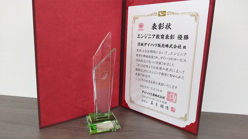 エンジニア教育とはサービススタッフの技術教育へ取り組んだ結果から出る各種検定の合格率やダイハツ検定1級スタッフの店舗配備率などから評価されます。