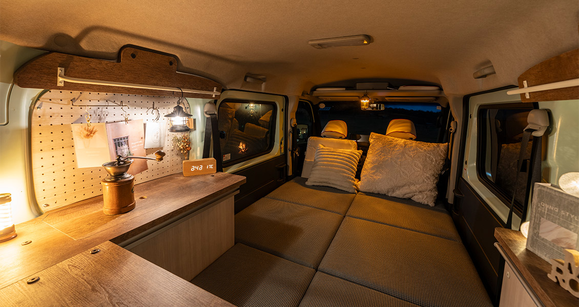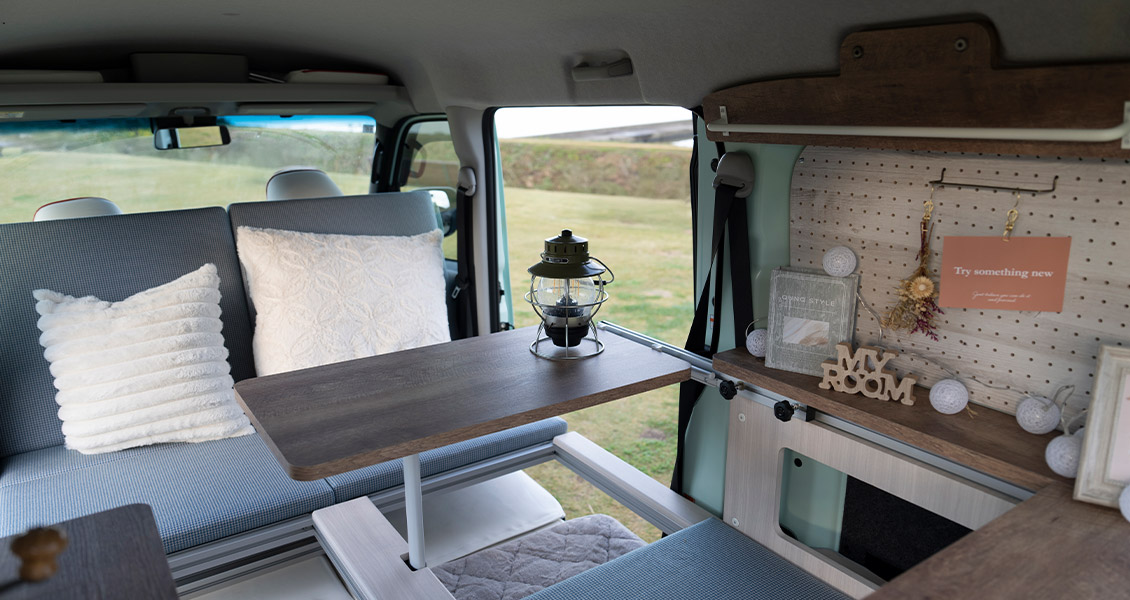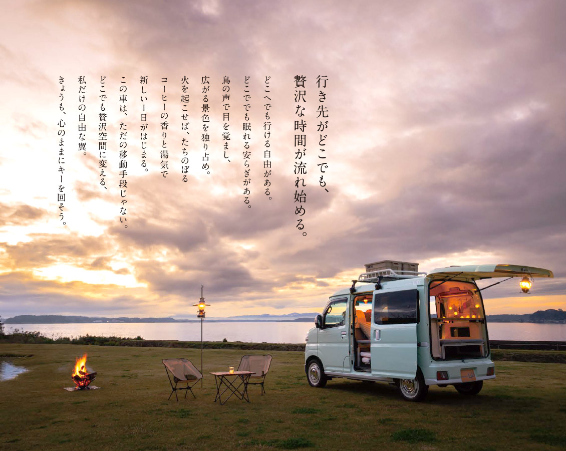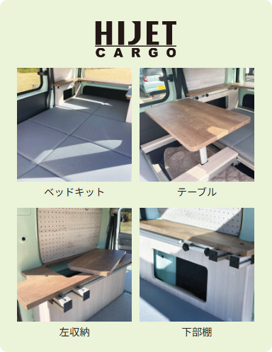 Photo:ハイゼットカーゴ ラクネル・リリィ(2WD CVT)。ボディカラーはアイスグリーン(G62)。選べるカラーパック/LED・パワースライドパックはメーカーオプション。 その他オプション装着車になります。小物類は装飾用となります。詳しくはスタッフまで。