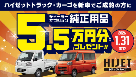【2026年1月31日まで】ハイゼットトラック・カーゴを新車でご成約の方に、ディーラーオプション純正用品5.5万円分プレゼント!対象の新車と純正用品をセットでご成約いただくことを条件に、割引いたします!