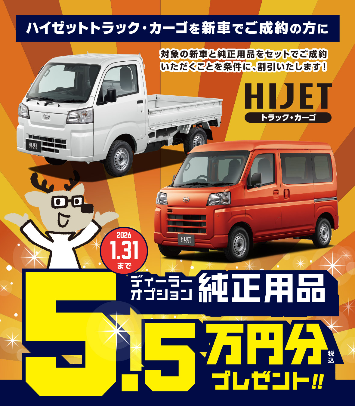 - 2025年11月1日から2026年1月31日までに、ハイゼットトラックとハイゼットカーゴの新車と用品55,000円(消費税込み)分以上をセットでご成約の上、2026年3月末日までにご登録いただくことを条件に55,000円(消費税込み)割引いたします。