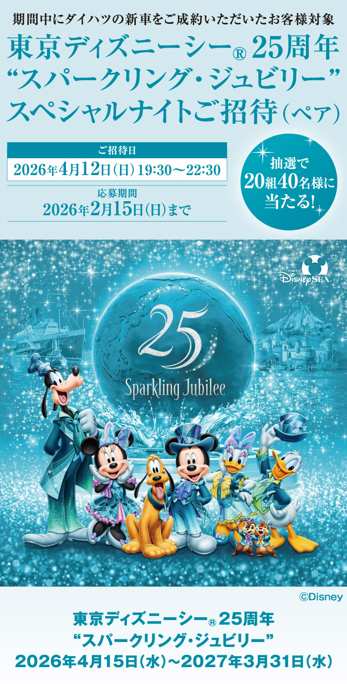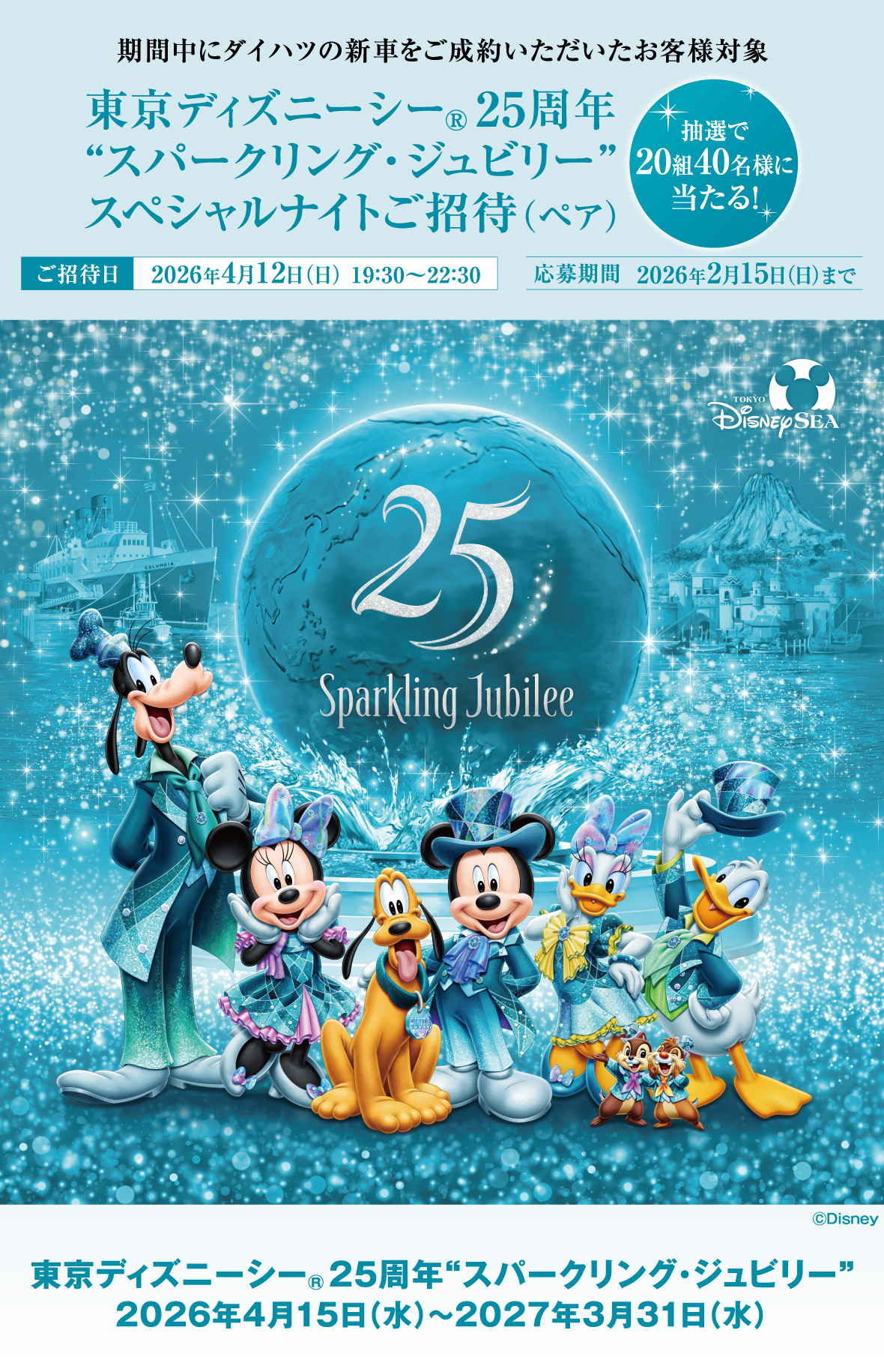 ■期間中に茨城ダイハツ直営店及び茨城県内のダイハツ車取扱販売店で新車をご成約いただいたお客様対象となります。■重複応募の場合は最新の情報のみ抽選対象となります。■応募方法は新車をご成約いただいた店舗での応募となります。■当選者の発表は賞品の発送をもってかえさせていただきます。■賞品は招待券(ペア)のみとなります。宿泊費、交通費、食費等はお客様ご負担となります。■ご当選いただいた賞品の払い戻しや他の券種への変更はできません。■東京ディズニーシー25周年“スパークリング・ジュビリー”スペシャルナイトパスポート(以下、本パスポート)は、東京ディズニーシーで指定日時(2026年4月12日(日)19:30~22:30)に限り使用いただけるパスポートです。■本パスポートの譲渡・転売はできません。パスポートの営利目的での不正な転売が確認された場合は、該当パスポートおよび不正な転売行為に関わった方が当選された全てのパスポート(転売対象となっているか否かにかかわらず)を株式会社オリエンタルランドにて無効にいたします。■アトラクションの運営およびエンターテイメントプログラムの開催は予告なく中止または変更となる可能性があります。また、中止または変更となった場合でも本パスポートの各種変更、払い戻し等は一切できませんのでご了承ください。