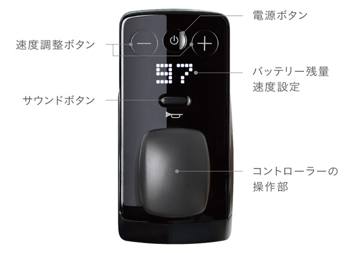 片手で簡単に操作できるコントローラー。速度調整、電源オン・オフも片手で。手を放すと自動でブレーキがかかります。コントローラーは、右利き、左利きに合わせて左右交換もできます。