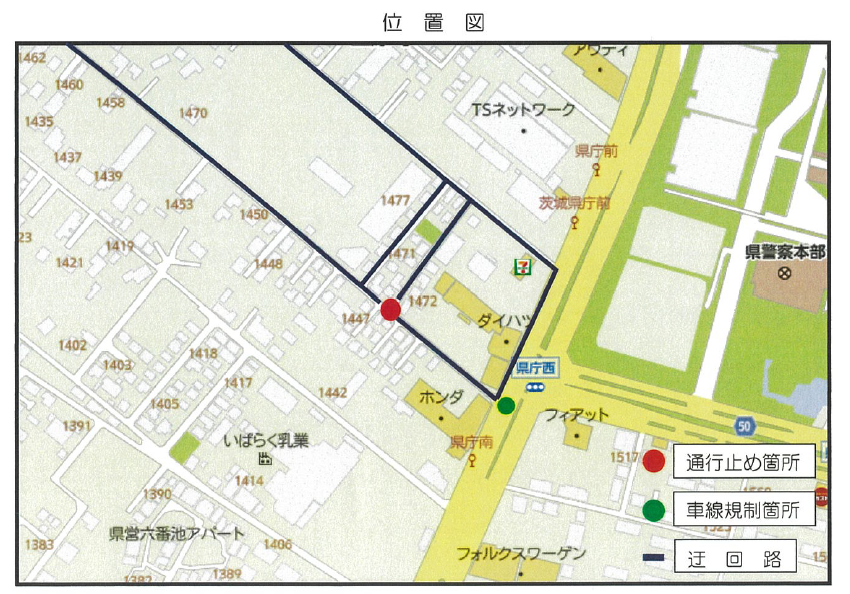 平素より当店をご利用いただき、誠にありがとうございます。 下記の期間中、水戸市による雨水管新設工事が行われており、店舗脇の側道からの進入が一部できない状況となっております。お客さまにはご不便おかけしますが、ご来店の際は正面入口側または案内看板に従ってお越しくださいますようお願いいたします。皆様にはご迷惑をおかけしますが、ご理解とご協力のほどお願い申し上げます。