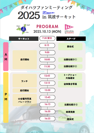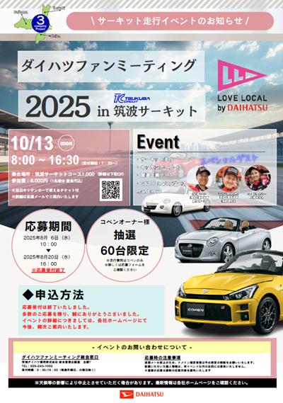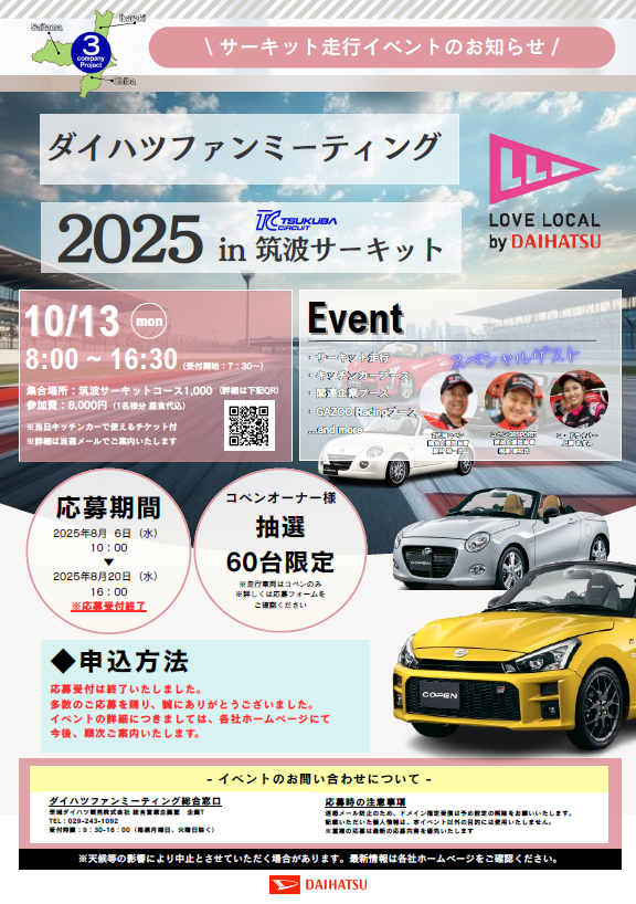コペンオーナー様以外も、ダイハツ車をお乗りいただいてるオーナー様・過去にダイハツ車に乗っていたオーナー様・ダイハツ車に興味がある方、モータースポーツに興味がある方どなたでもご参会いただけるイベントになっております。