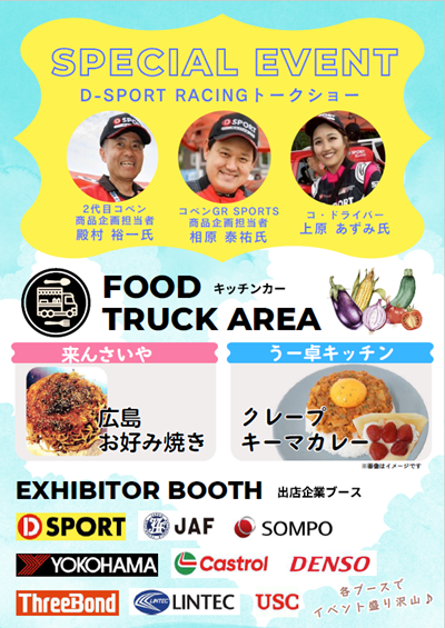 走行会はもちろんのこと、ダイハツGAZOORacingチームのスペシャルイベントやキッチンカー、各ブランドのブース出展など、走らなくても楽しめるコンテンツを多数ご用意しております!