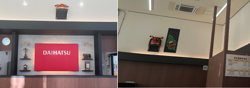具体的には、石岡市は獅子舞が盛んな街と聞いておりましたが、常陸国總社宮例大祭『石岡のおまつり』では、30以上の獅子舞が順々に舞われる姿が圧巻だそうです!そこで・・・・何と!!何と!!店舗の壁面に獅子頭を2カ所に設置しました!!