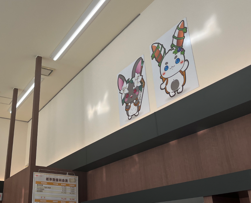 その他に、石岡市観光協会マスコットキャラクター『ししまる君』も許可を頂き、モチーフに使用をさせて頂きましたし、石岡市公認マスコットキャラクターの『嗜みうさぎ モモア』ちゃんと『満喫うさぎ カイ』君も、勿論お出迎えをしています!