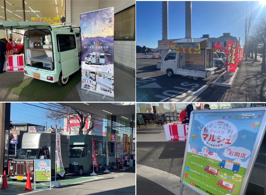 当日は来場記念品に新鮮卵を用意し、スタンプラリーやダイハツマルシェ(キッチンカーが両日で5台)を開催、車両は目玉車と当社で初めて販売する、軽キャンピング仕様車『ラクネル・リリイ』も展示して大いに盛り上がりました!