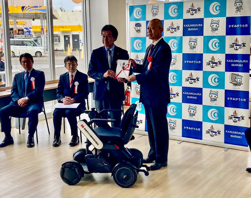 今回の『かすみがうら市市民窓口センター』のオープンと言うのは、多くの市民の皆様に寄り添い、活用して頂きたい市民の為の『集いステーション』的な役割を担う場所では無いのか?? と考えた時に、ご年配の方や足のご不自由な方など、歩行に不安を抱える市民の皆様に、安心で快適な移動手段の提供を考え、電動車椅子型近距離モビリティ『WHILL』1台の寄贈をさせて頂く事と致しました。