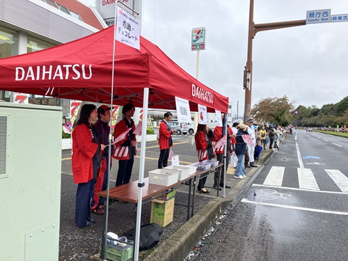 今回のダイハツ応援隊の目玉はおやつの『一口チョコレートと塩飴』でした!私は、塩飴の担当でしたが、慣れる迄はランナーに渡すのに苦労をしました~!!しかし、渡す時には多くのランナーが声援に手を振り答えてくれたことは、本当に温かい気持ちになりました!!