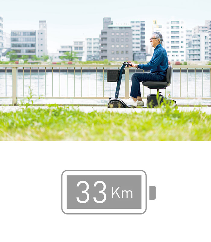 大容量のバッテリー *走行可能距離はJIS T 9208:2016で定められた条件で測定した値です。走行可能距離は使用環境や操作方法等により変化します。 -