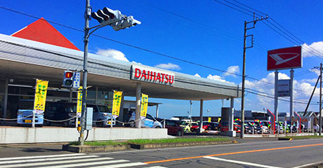 自動車ディーラーと自然豊かな下妻店の目印は、ダイハツマークの看板と赤い三角屋根です。