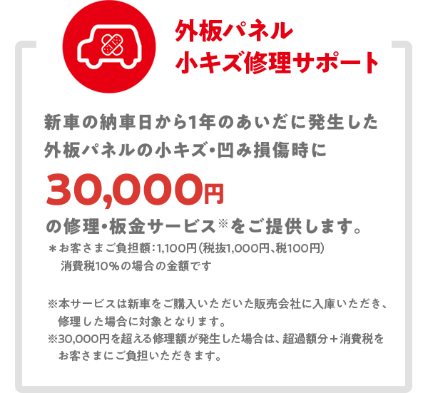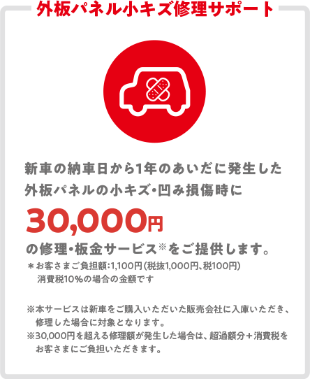 - 外板パネル小キズ修理サポートおよびタイヤパンク新品交換サポートは、いずれも保証期間中一回限りの提供となります。