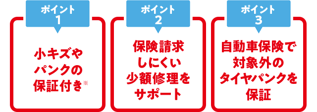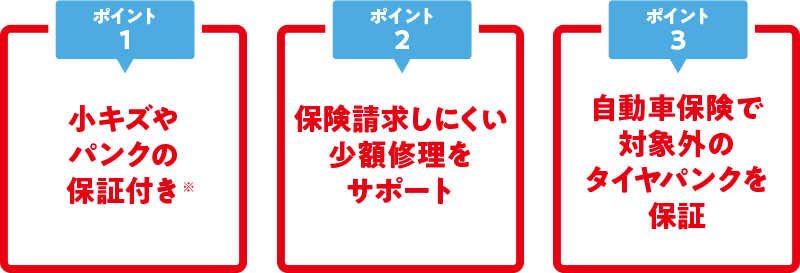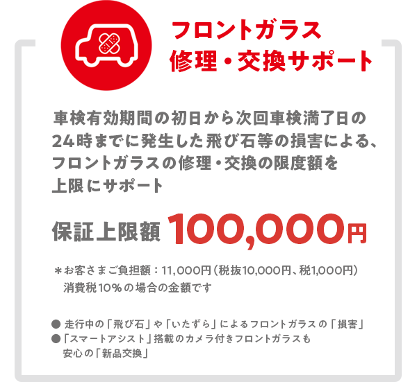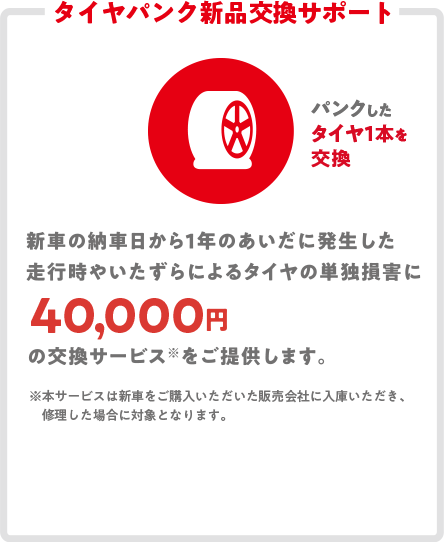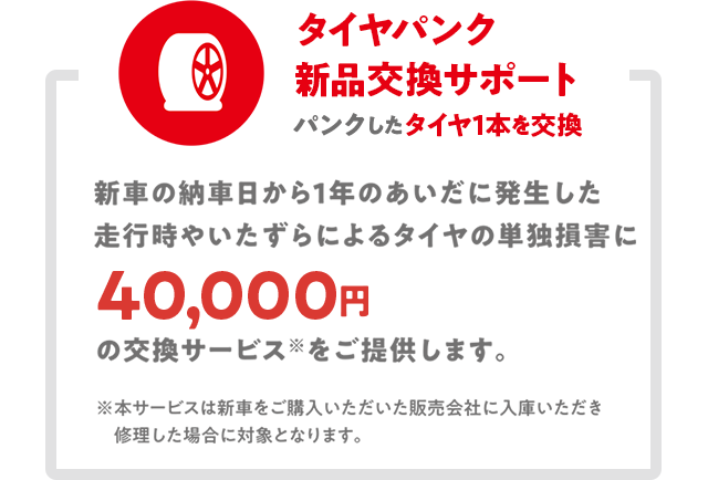 - 外板パネル小キズ修理サポートおよびタイヤパンク新品交換サポートは、いずれも保証期間中一回限りの提供となります。