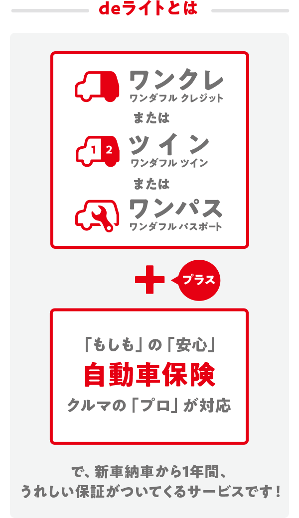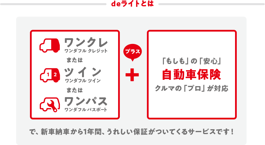 - 本サポートは、納車日時点で「自動車保険」と「ワンダフルパスポート」にご加入いただいているお客様、または納車日時点で「自動車保険」にご加入いただいており、「ワンダフルクレジット(ワンダフルツイン含む)」で新車を購入されたお客様が対象となります。