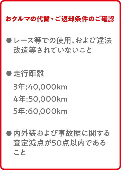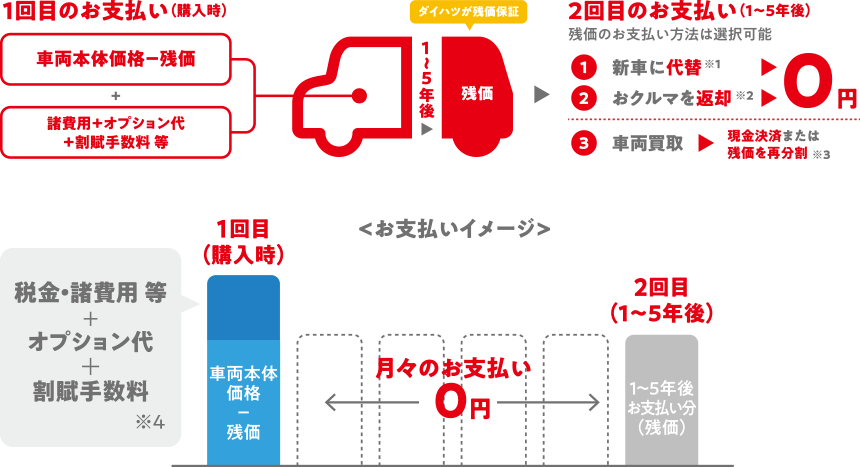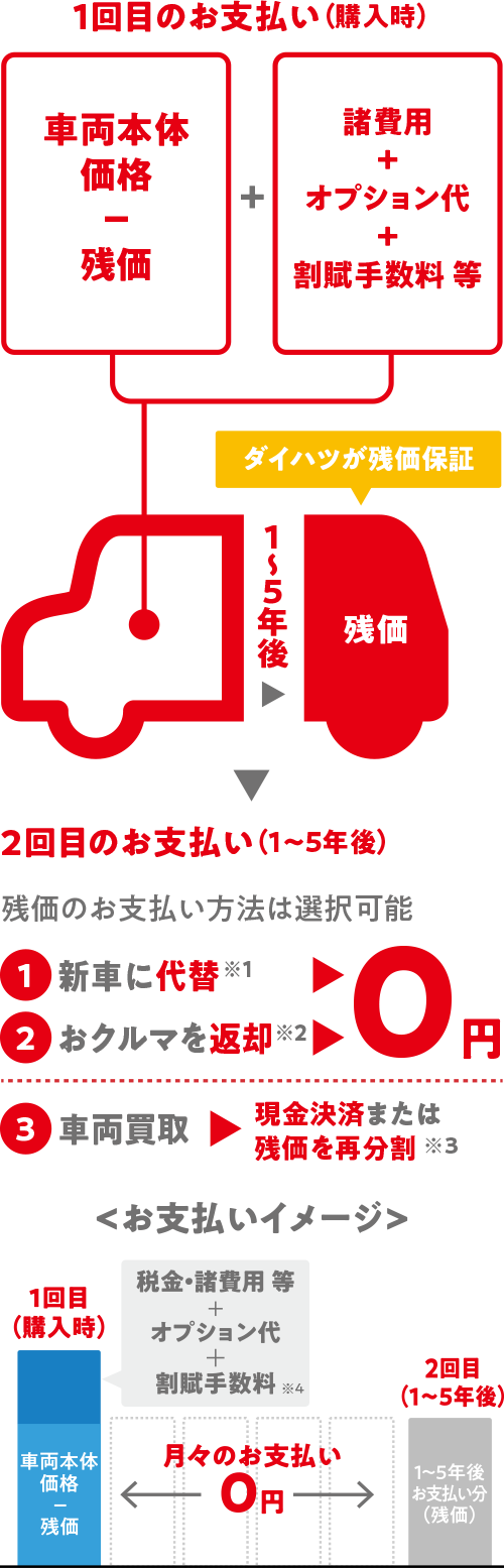 ●設定残価は、車両状態が規定内である場合のみ保証いたします。●ご購入いただいた販売会社に車両をご返却の上、新車にお乗り換えの場合(※1)、およびご購入いただいた販売会社にご返却の場合(※2)、残価分のお支払いは不要ですが、車両状態が事前に定められた規定外である場合には、別途精算金をいただきます。●最終回でお買い上げ(現金決済・再分割)をご選択された場合、最終回のお支払い額(残価)を含めたお支払い合計額は、一般的なローンの方が軽くなる場合があります。●お買い上げの際に再分割も選択できます(※3)、その際には、別途条件があります。詳しくは販売会社スタッフにお問い合わせください。●お支払いについてはこの他にさまざまなプランを設定できます。詳しくは販売会社スタッフにお問合わせください。