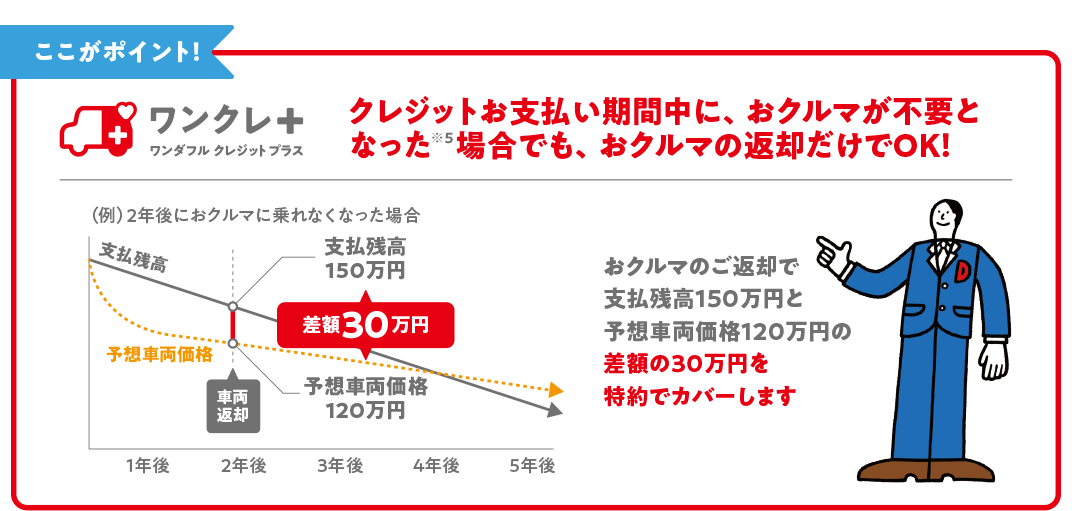 • ご購入いただいた販売会社に車両をご返却の上、新車にお乗り換えの場合(※1)、およびご購入いただいた販売会社に車両をご返却の場合(※2)、残価分のお支払いは不要ですが、車両状態が事前に定められた規定外である場合には、別途精算金をいただきます。