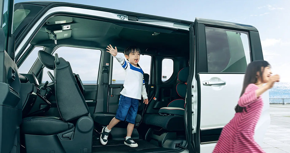 - 使い方広がる、大きな開口。 前後のドアにピラーを内蔵することによって生まれた大開口のドアは、大きな荷物の出し入れも、お子さまとの乗り降りもスムーズ。両側スライドドアなので狭い駐車場や壁際でも安心です。